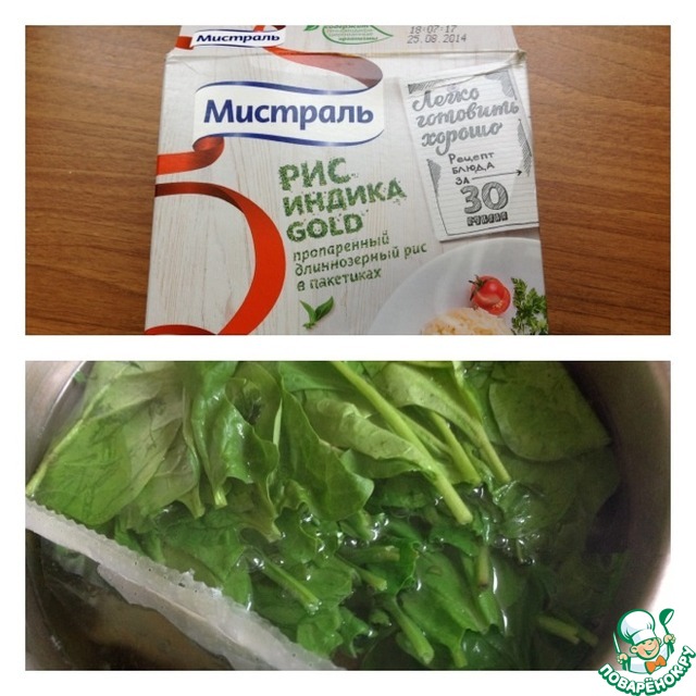В кипящую подсоленную воду закинуть листья шпината и 2 пачки риса. Варить, как указано на упаковке.
