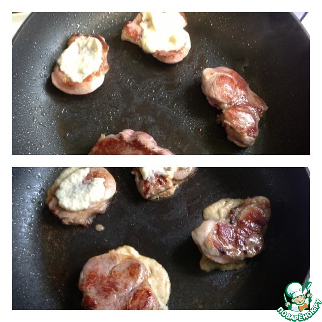 Обжаренное мясо посолить и поперчить. Смазать яблочно-сметанным соусом, огонь убавить до минимального и обжарить еще 2 мин. Затем мясо перевернуть и смазать другую сторону сметанным соусом, обжарить 2 мин.