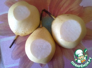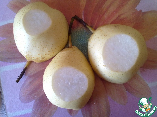 Разрежьте груши пополам вместе с плодоножкой и удалите сердцевину с небольшим количеством мякоти.