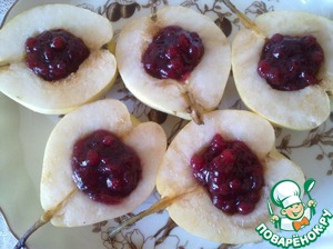 Каждую половинку груши наполнить соусом из дикой брусники d'arbo, сверху полейте медом.
