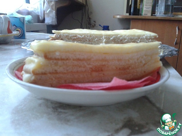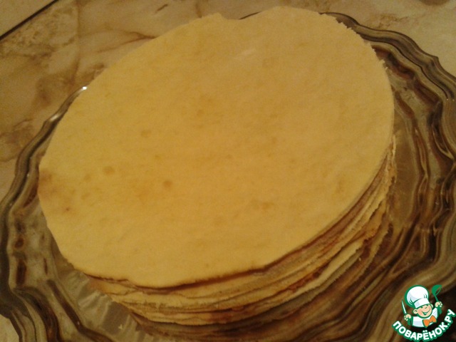Коржи обрезаем под обычную среднюю тарелку ещё горячими. И сразу же смазываем горячим кремом (я обрезала под большую тарелку и это было моей ошибкой, хотя на вкус это вряд ли повлияло)