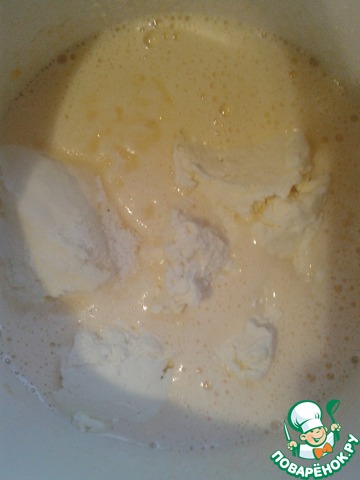 В яичную смесь добавляем творог, соду, соль и 1 стак. муки. Снова всё взбиваем