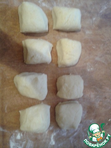 Тесто делим на восемь приблизительно равных кусочка. Каждый кусочек заворачиваем в пакет и кладём в холодильник на 1 час