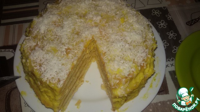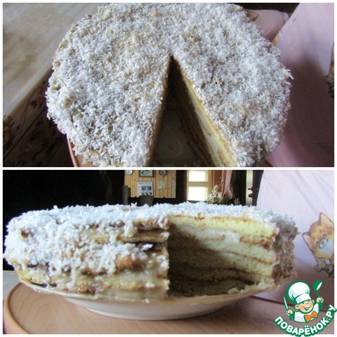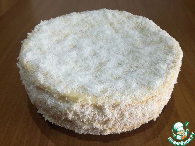 Готовый тортик посыпаем кокосовой стружкой и ставим для пропитки в прохладное место на ночь (простите, что на фото без стружки, у меня в семье её не все любят)). После пропитки торт получается необычайно мягким и очень вкусным, хотя вкус крема сильно не ощущается.