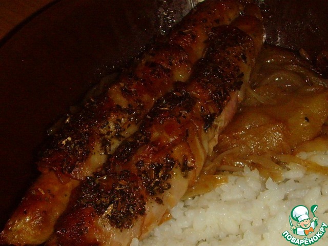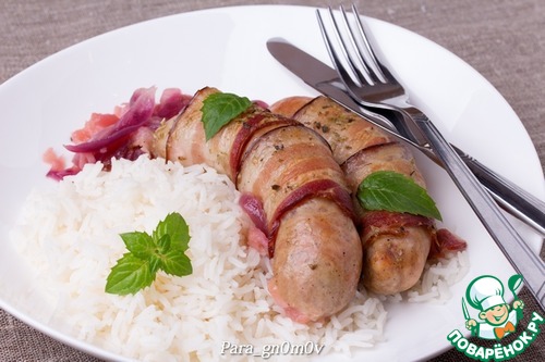 Рецепт «Колбаски, запеченные на фруктово-луковой подушке»: