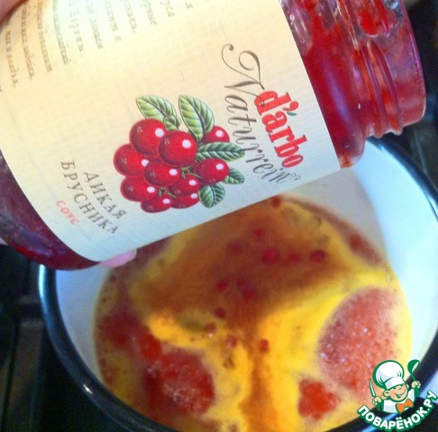 Для соуса смешать сок апельсина, брусничный соус Д`арбо и сахар. Уваривать на медленном огне в течении десяти минут до загустения.