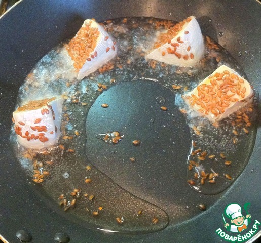 Кружок Камамбера разрезать на 8 секторов и обвалять в льняном семени. Его можно с успехом заменить на кунжут.