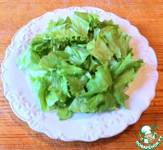 Салатные листья порвать или нарезать и выложить на порционную тарелку.