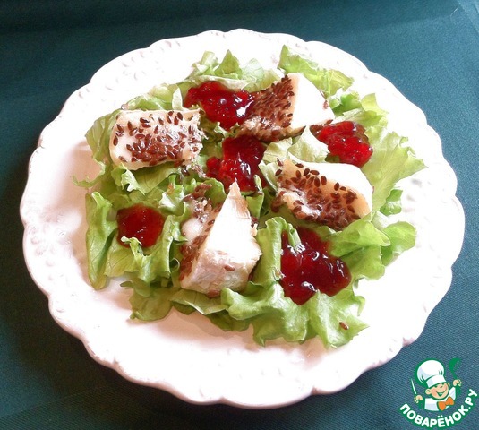 Зелёный салат с камамбером и брусничным соусом