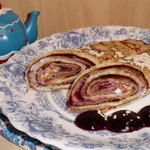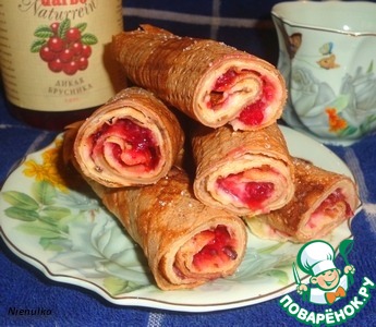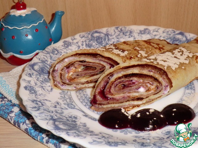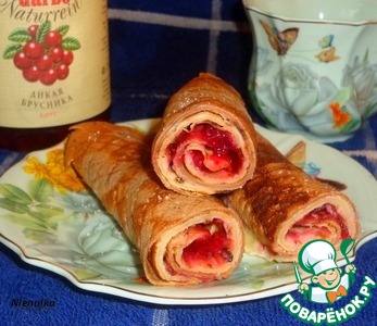 Темный блинчик смазываем сливочным соусом, на него кладем светлый и тоже смазываем сливочным соусом. Сверху распределяем брусничный соус. Сворачиваем рулетик.