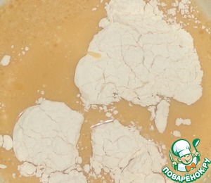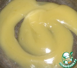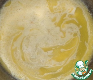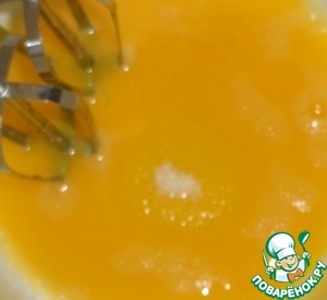 Приготовим тесто. Для этого необходимо взбить яйцо с сахаром и щепоткой соли. Добавляем топленое молоко, можно и обычное молоко.