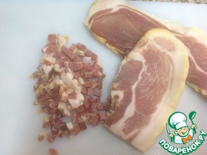 Порезать хамон мелким кубиком. Заменить хамон можно копченым окороком или беконом.
