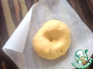 А к тому времени подтянулась тяжелая артиллерия на помощь, мой сынок большой любитель полепить что-нибудь из теста! Итак, большой шарик кладем на кусок пекарской бумаги для более удобной лепки.