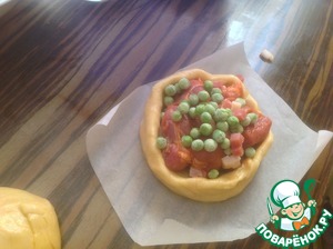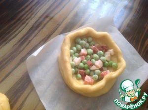 Добавить в зеленый горошек, перемешать. Консервированный горошек не подойдет, так как при выпекании превратится в кашу.