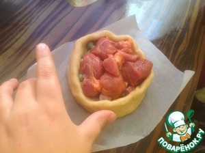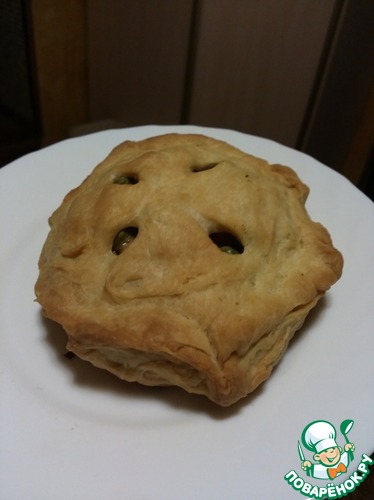Правда, я немного напортачила с тестом, - надо было мешать крюком, а я порубила в комбайне, - в результате оно получилось чуть более жидким и форму не удержало. Есть оправдание: я делала эти пирожки абсолютно между делом, не задумываясь, - настолько простой и понятный рецепт (описание). Сам процесс до отправки в духовку занял минут 30. Делала с курицей вместо свинины (куриное бедро)