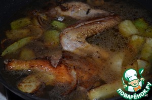 Утку разрезаем на порционные куски, не отрезая кожу и жир.