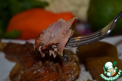 Через 2 часа утка готова. Репа впитала в себя излишний утиный жир и специфический вкус утки. А утиное мясо стало очень нежным и вкусным, легко отстает от костей.