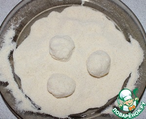Берём тесто чайной ложкой и панируем в манке... катаем небольшие шарики.