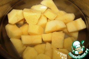 Почистить и нарезать крупными кубиками картофель, поместить его в кастрюлю с холодной подсоленной водой, довести до кипения и варить 5 минут.