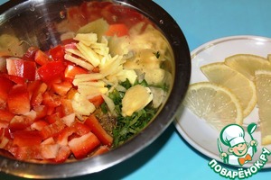 В миску с пряностями поместить, нарезанную крупно четвертину болгарского перца, мелкорубленную зелень кинзы (оставить несколько листочков для украшения), имбирь, нарезанный соломкой, выдавить сок из лимона.