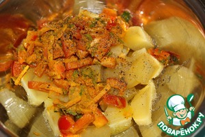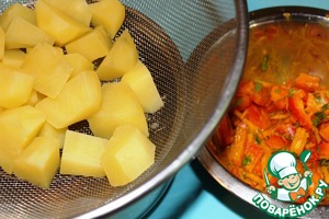 Полуготовый картофель откинуть на дуршлаг, пряности и овощи перемешать.