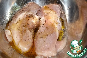 Куриное филе посолить, поперчить и сбрызнуть оливковым маслом.