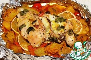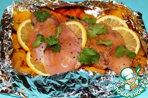 Сформировать из фольги форму для запекания, выложить в нее в один слой подготовленный картофель, сверху курицу, ломтики лимона, листики кинзы, сбрызнуть оливковым маслом.