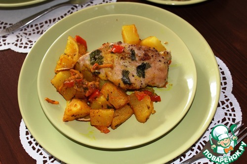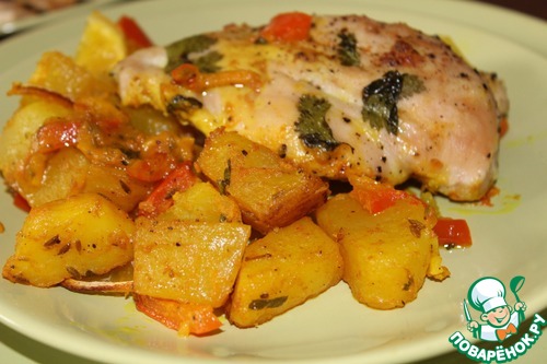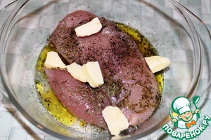 Куриную грудку, помещенную в миску солим, перчим, приправляем тимьяном, добавляем столовую ложку оливкового масла, сверху несколько кусочков сливочного масла. Тщательно обмазываем мясо маслом с пряностями.
