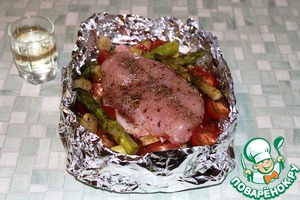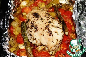 Из фольги сформировать прямоугольную форму, на дно которой выложить подготовленные овощи. В середину - куриную грудку, влить сверху немного белого вина (приблизительно 30 мл).