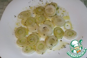 Белую часть лука-порея нарезаем кольцами, сбрызгиваем оливковым маслом, чуть-чуть присыпаем тимьяном.