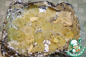 Из фольги формируем прямоугольную форму, на дно выкладываем лук-порей, несколько кусочков сливочного масла.