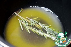 В миске смешайте апельсиновый сок, уксус, мед. Положите розмариновые веточки и поставьте на сильный огонь.