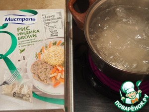 Наливаем в кастрюльку воду, добавляем соль (1/2 ч. л.), ставим на огонь и доводим до кипения. Пакетики с рисом кладем в кипящую воду и варим на медленном огне 35 минут.