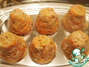 Сверху конусных форм сделать небольшое углубление и одеть отложенные грибочки с большими шляпками. Получились мясные грибочки :-) Готовим на пару 25 минут.