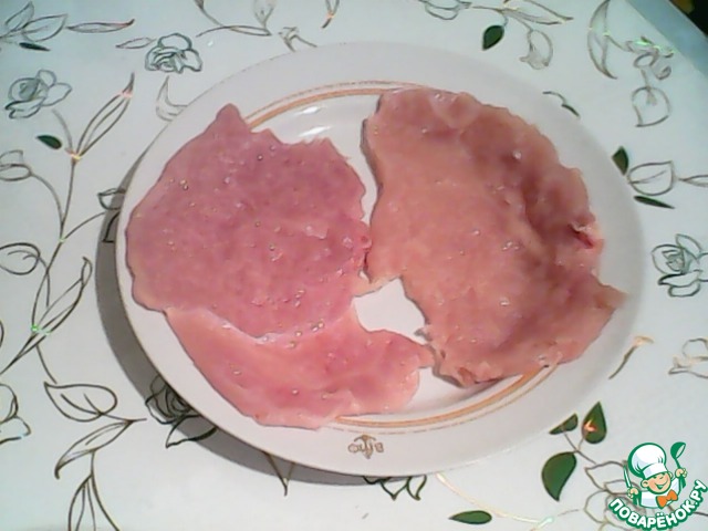Достаньте грудки и начинайте делать рулет. Положите на каждую грудку ломтик сыра, затем ломтик ветчины.