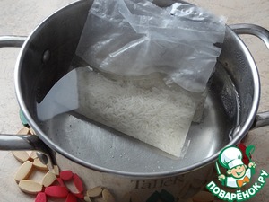 В закипевшую подсоленную воду выложите рис. Я использую варочные пакетики ТМ Мистраль - очень удобно! Рис - белый ароматный Басмати. Этот рис варится быстро, около 12 минут, позволяя сэкономить общее время приготовления блюда.