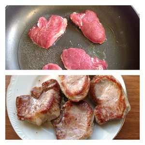Мясо обжарить в раскаленной сковороде в небольшом количестве масла с двух сторон. На каждую сторону не более 2 мин. Готовые мясо выложить на тарелку