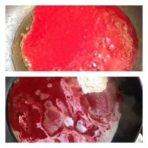 В оставшееся масло и сок после жарки мяса вылить вишневое пюре. Огонь убавить до минимума. Влить сливки, посолить и добавить крахмал. Постоянно помешивать до загустения соуса