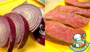 Говядину разрезать на 4 стейка. Лук на кольца или полукольца, шириной около 1 см.