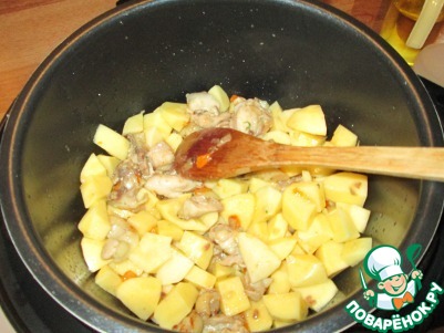 Окорочок нарезаем на кусочки (можно использовать свинину или куринное филе)