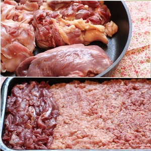 Подготовим нужные ингредиенты - мякоть утки, грудки утки, и мякоть с нижней части курицы. Из мякоти утки и мякоти курицы делаем фарш, а грудку режем на тонкие полоски. берем удобный противень и выкладываем все слоем примерно 4 см.