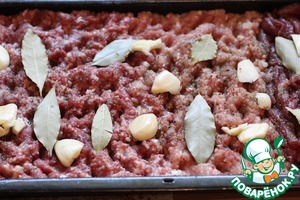 Солим и перчим, посыпаем сухим тимьяном, пальцами делаем не большие углубления по всей поверхности, так чтоб мясо хорошо промариновалось. Раскладываем лавровые листья. Чеснок почистить и придавить ножом, также разложить по поверхности мяса. Сверху все равномерно полить коньяком. Накрыть пищевой пленкой и держать в холодильнике 12 часов.