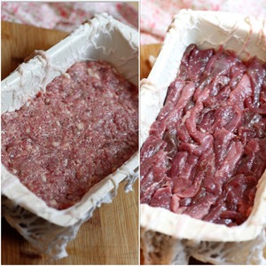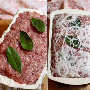 Далее сетку аккуратно расстелить по форме, так чтоб концы свисали. Половину фарша выложить в форму. Потом тонкие полоски утиной грудинки выложить одним слоем.