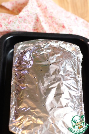Пате плотно закрываем фольгой и по всей поверхности делаем дырочки деревянной шпажкой. Форму ставим на противень, заливаем кипятком до середины формы с пате. Разогреваем духовку до 170 градусов. И готовим два с половиной часа.