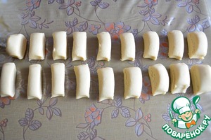 Раскатать тесто колбаской, порезать на 16-18 одинаковых кусочков.