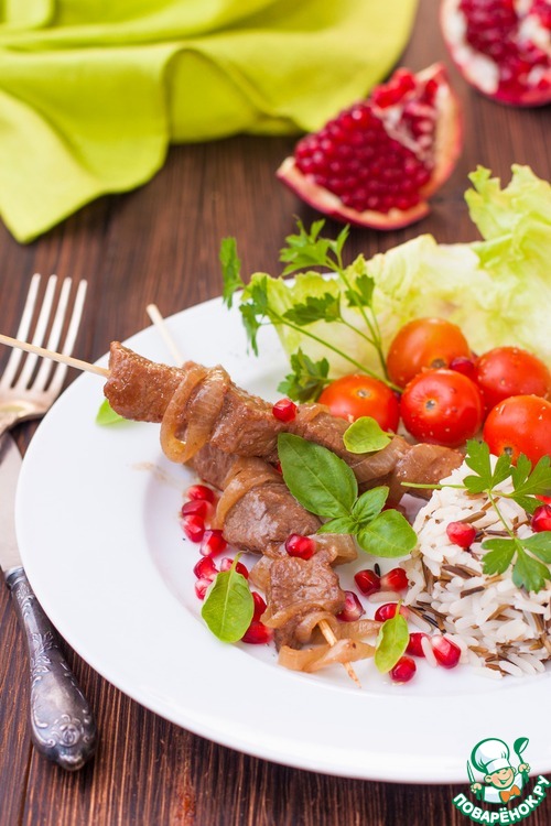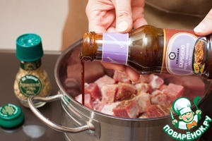 Добавить соус-маринад Барбекю с медом и чесноком (если такого соуса у вас нет, просто исключите его) и уберите мясо для маринования в холодильник, накрыв крышкой. Очень удобно делать это утром, перед работой, к вечеру мясо промаринуется, и вам останется лишь купить по дороге гранат, а дома, пока варится рис, приготовить шашлык, используя всего одну кастрюлю - ту, в которой мариновали мясо