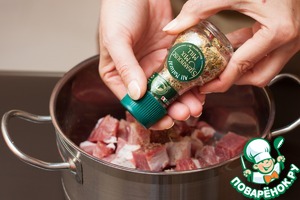 Мясо (свинину или баранину) нарезать кубиками, посыпать специями для стейка или шашлыка, немного посолить