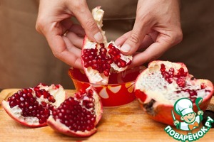 А пока очистите четвертинку граната и нарежьте головку репчатого лука кольцами. Из части граната выжмите сок при помощи марли
