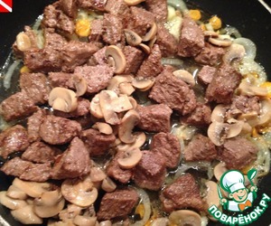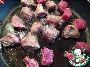 Телятину режем на кусочки примерно 1,5*1,5см и также обжариваем до образования румяной корочки.