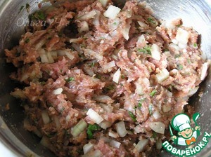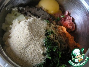 Тем временем к фаршу добавить измельченный лук, чеснок и петрушку, всыпать все пряности, специи и панировочные сухари, разбить яйцо.